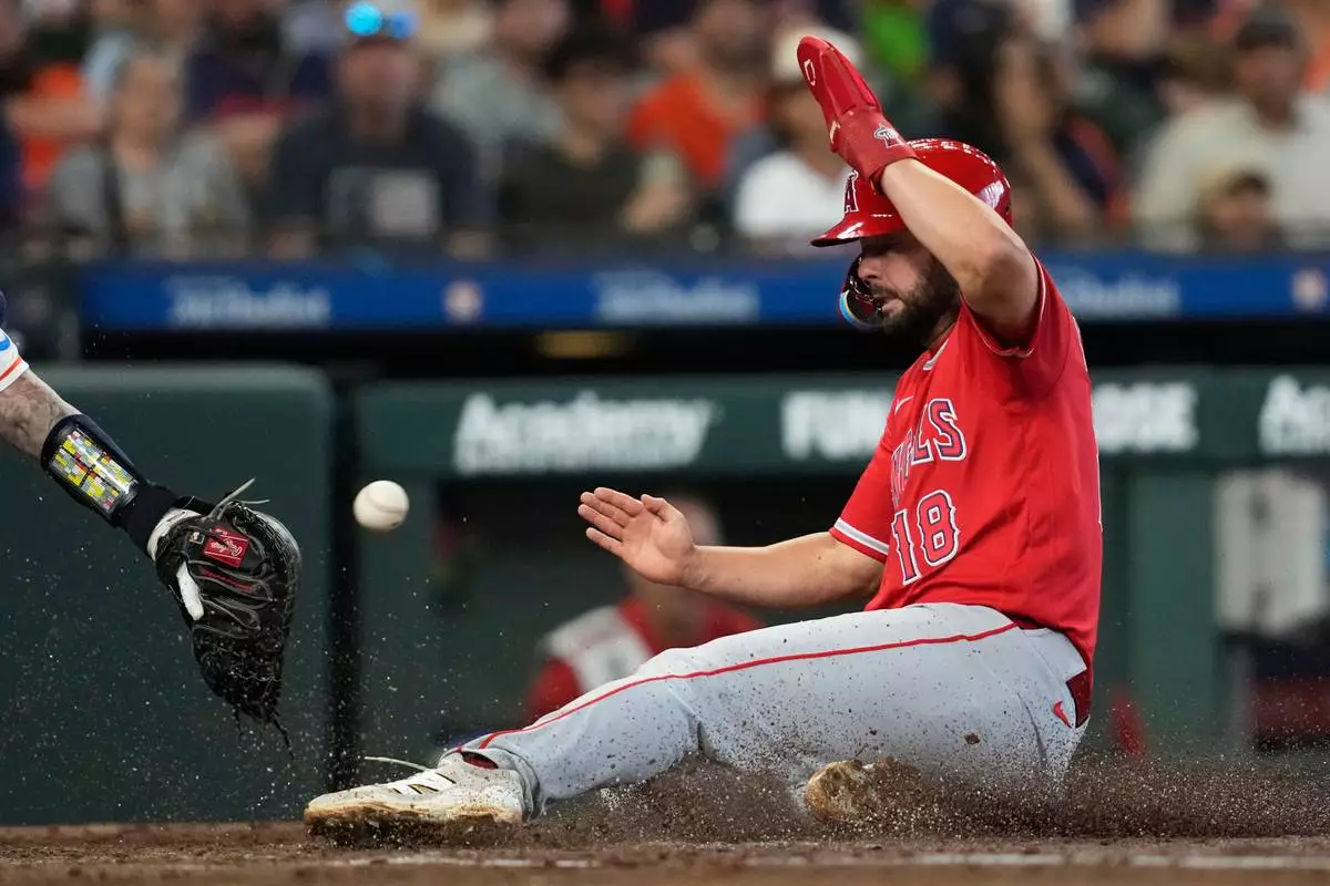 Los Angeles Angels' Nolan Schanuel scores ahead of a throw to Houston Astros catcher Christian Vazquez during the third inning of a baseball game in Houston, Sunday, March 29, 2026. (AP Photo/Ashley Landis)
