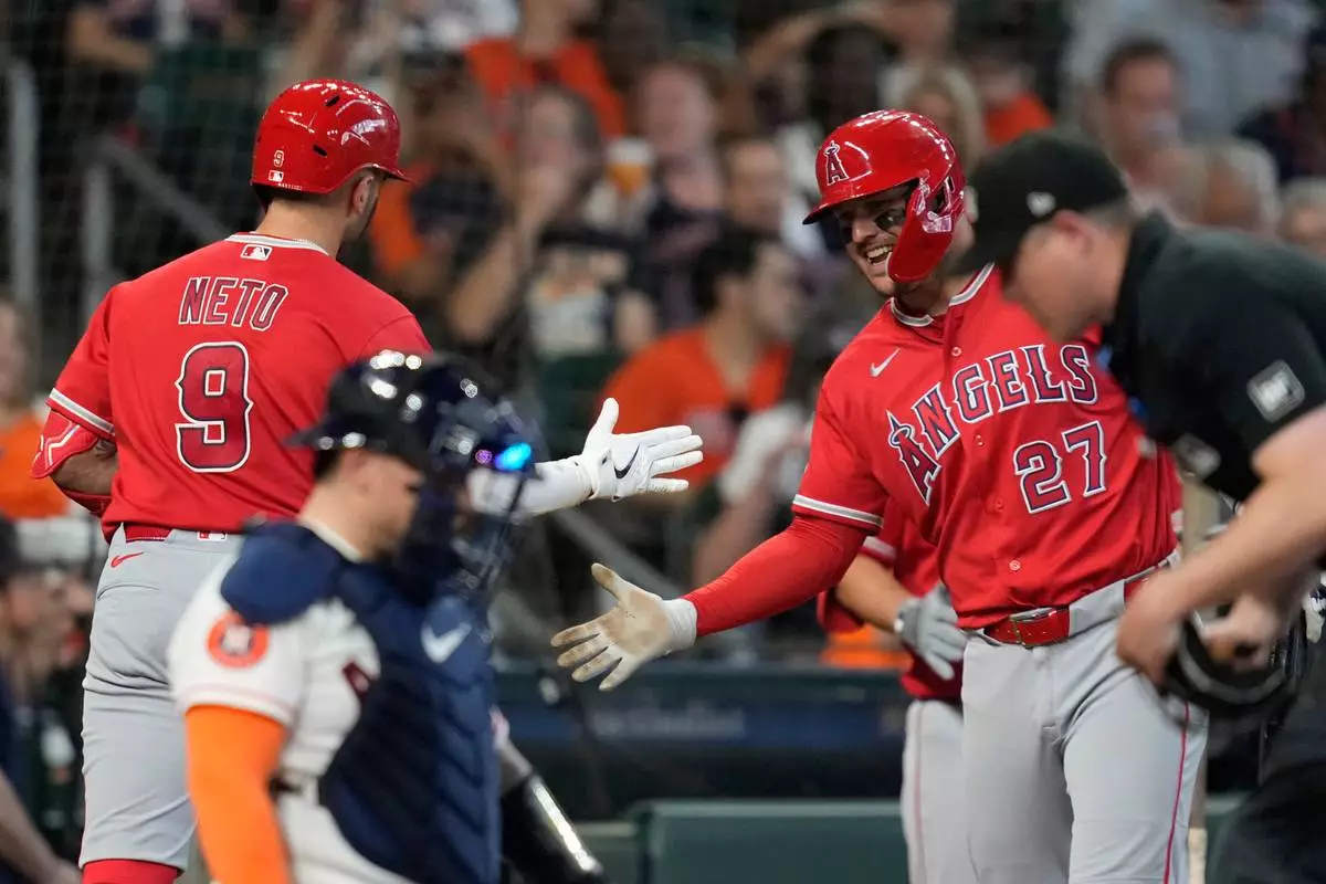 Los Angeles Angels' Zach Neto (9) celebrates with designated hitter Mike Trout (27) after hitting a home run during the fourth inning of a baseball game against the Houston Astros in Houston, Sunday, March 29, 2026. (AP Photo/Ashley Landis)