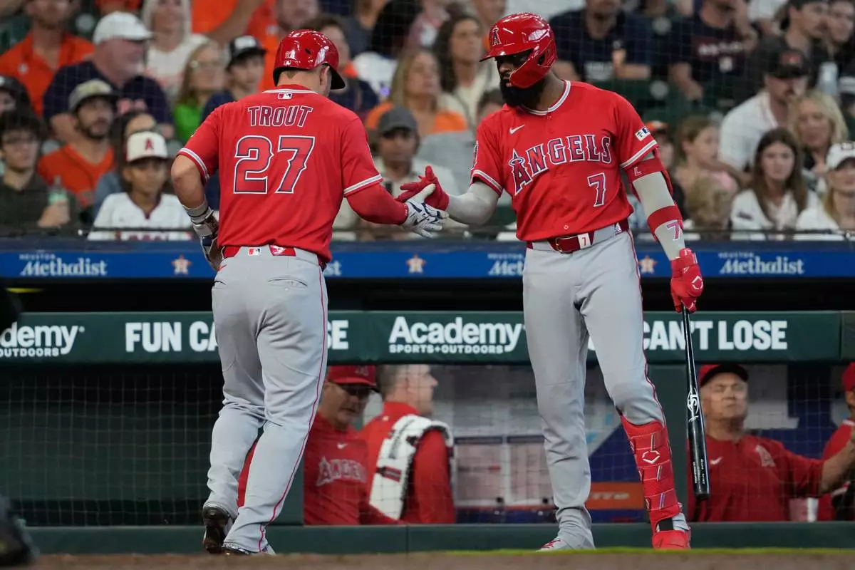 Los Angeles Angels designated hitter Mike Trout celebrates with Jo Adell (7) after scoring during the third inning of a baseball game against the Houston Astros in Houston, Sunday, March 29, 2026. (AP Photo/Ashley Landis)