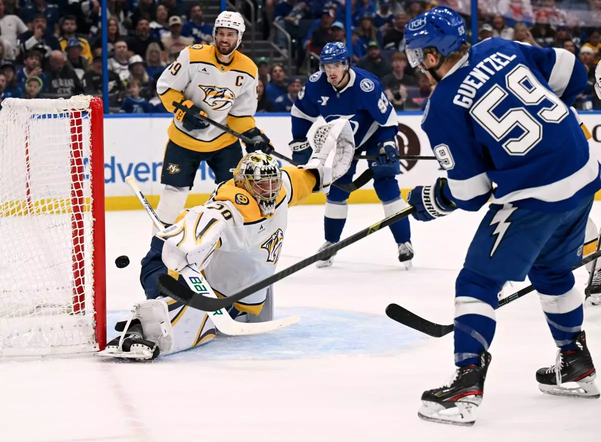 Guentzel pulled the Lightning even at 13:32 of the second period as a shot from Darren Raddysh hit the glove of Roman Josi and came to Guentzel at the left circle with an open net.