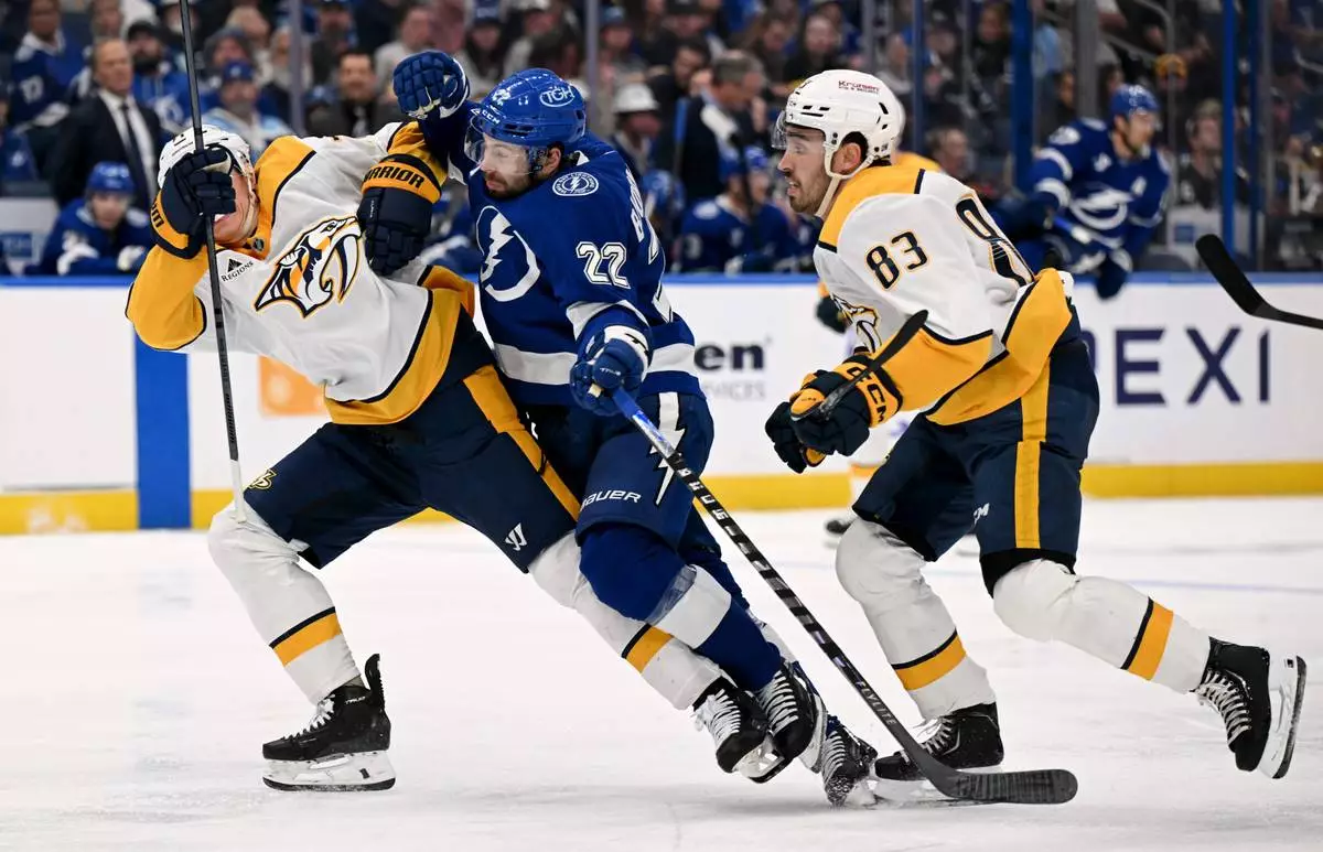 TAMPA, Fla. (AP) — Jake Guentzel had a goal and two assists while Corey Perry broke a third-period tie to give the Tampa Bay Lightning a 3-2 victory against the Nashville Predators on Sunday to move into first place in the Atlantic Division.