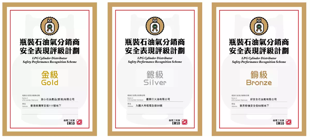 EMSD announces latest rating results of LPG Cylinder Distributor Safety Performance Recognition Scheme
