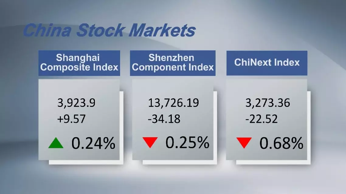 Chinese stocks closed mixed on Monday, with the benchmark Shanghai Composite Index up 0.24 percent to 3,923.29 points. The Shenzhen Component Index closed 0.25 percent lower at 13,726.19 points.
