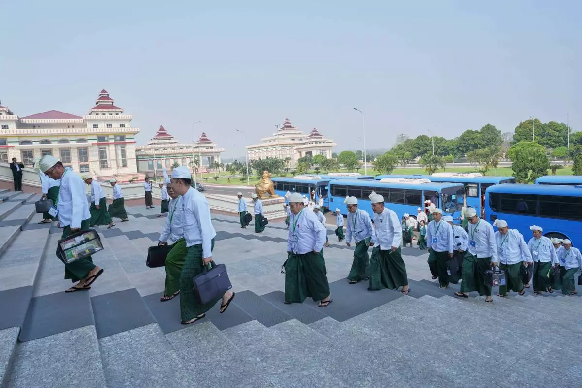Myanmar lawmakers arrive to attend a session at Lower House of Parliament in Naypyitaw, Myanmar, Monday, March 30, 2026. (AP Photo/Aung Shine Oo)