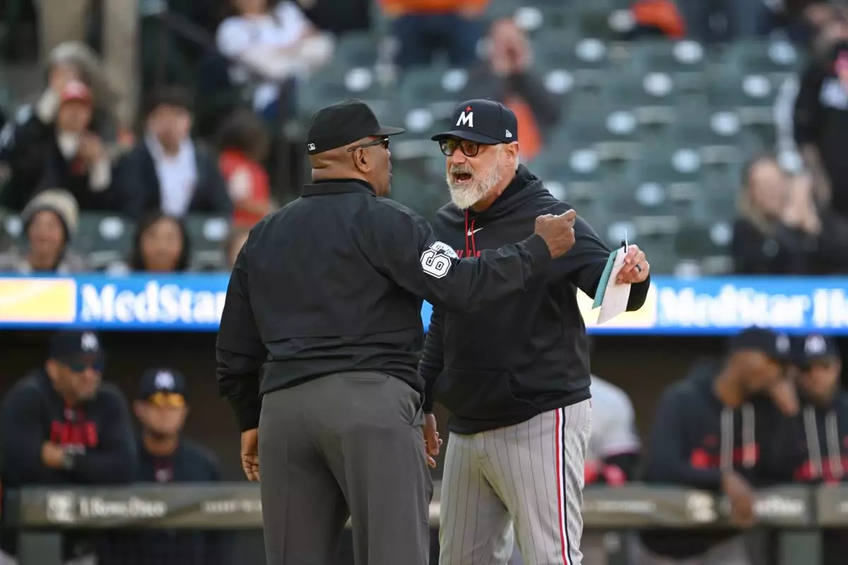 Minnesota Twins manager Derek Shelton argues with umpire Laz Diaz over a pitch challenge during the ninth inning of a baseball game against the Baltimore Orioles, Sunday, March 29, 2026 in Baltimore. (AP Photo/Gail Burton)