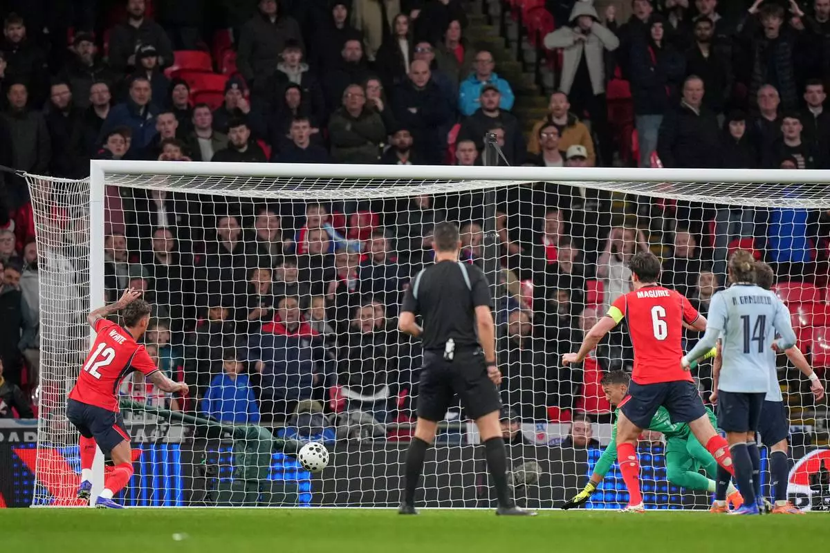 England's Ben White, left, scores his side's opening goal during the international friendly soccer match between England and Uruguay in London, Friday, March 27, 2026. (AP Photo/Alastair Grant)