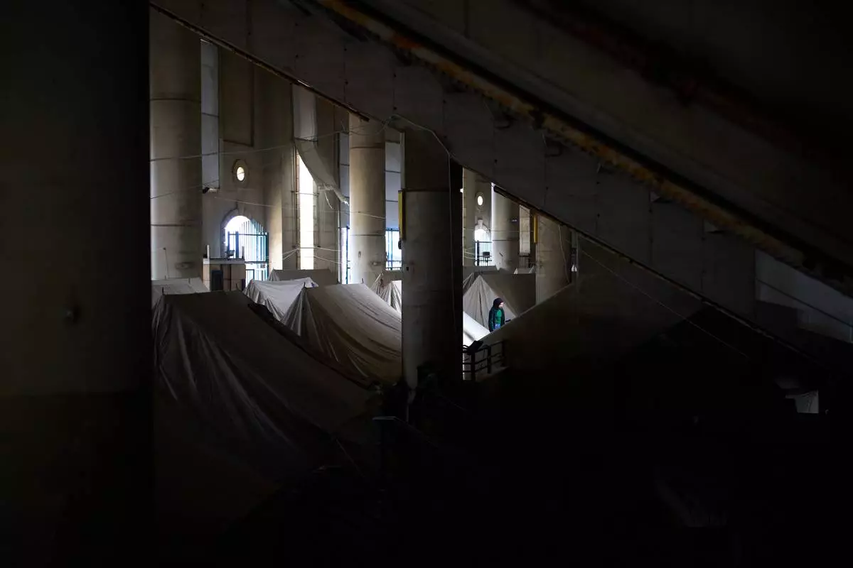A displaced woman walks next to tents set up inside the Camille Chamoun Sports City Stadium, which has been turned into a shelter for people displaced by Israeli airstrikes in southern Lebanon, in Beirut, Lebanon, Monday, March 30, 2026. (AP Photo/Emilio Morenatti)