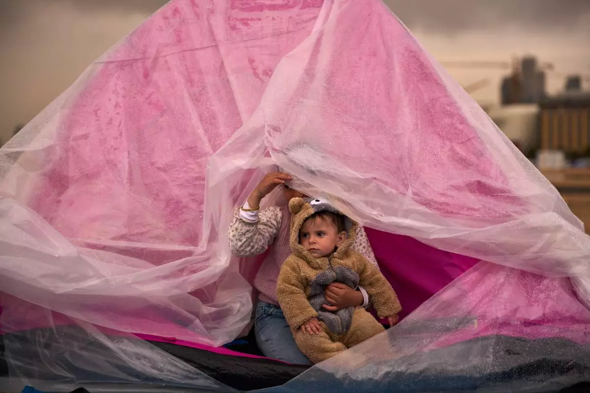 Children displaced from Beirut's southern suburb of Dahiyeh shelter from the rain inside their tents along the coast in Beirut, Lebanon, Thursday, March 26, 2026. (AP Photo/Emilio Morenatti)