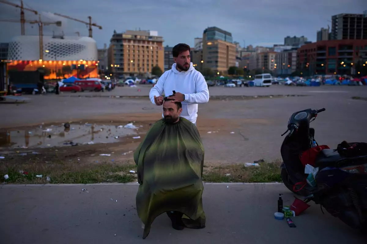 Hussein gets a haircut from Hassan in an open field where people who fled Israeli strikes in southern Lebanon have set up tents as shelters, in Beirut, Lebanon, Wednesday, March 25, 2026. (AP Photo/Emilio Morenatti)
