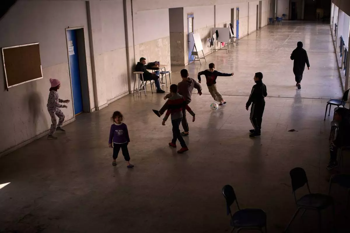 Displaced children from Beirut's southern suburbs play soccer inside a school converted into a shelter in Beirut, Lebanon, Friday, March 27, 2026. (AP Photo/Emilio Morenatti)