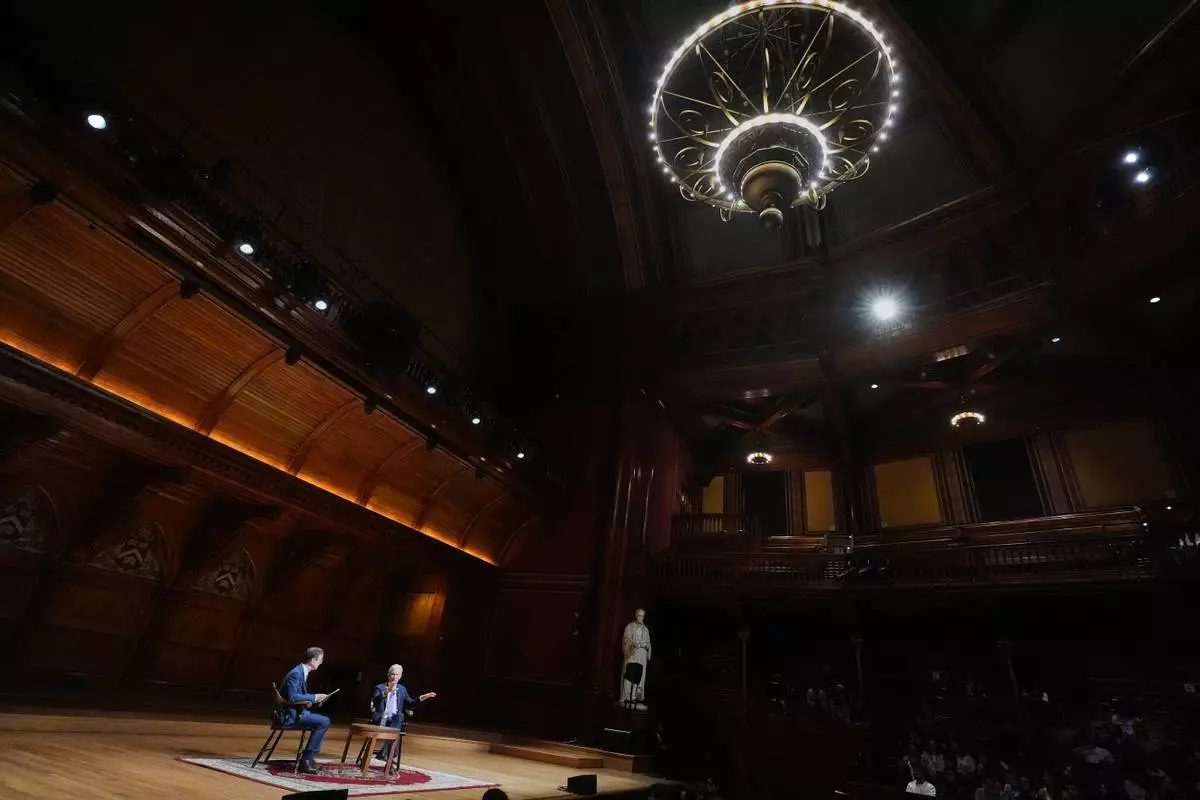 Federal Reserve Chair Jerome Powell, seated at right, gestures while addressing students with economics professor David Laibson at Harvard University, Monday, March 30, 2026, in Cambridge, Mass. (AP Photo/Charles Krupa)