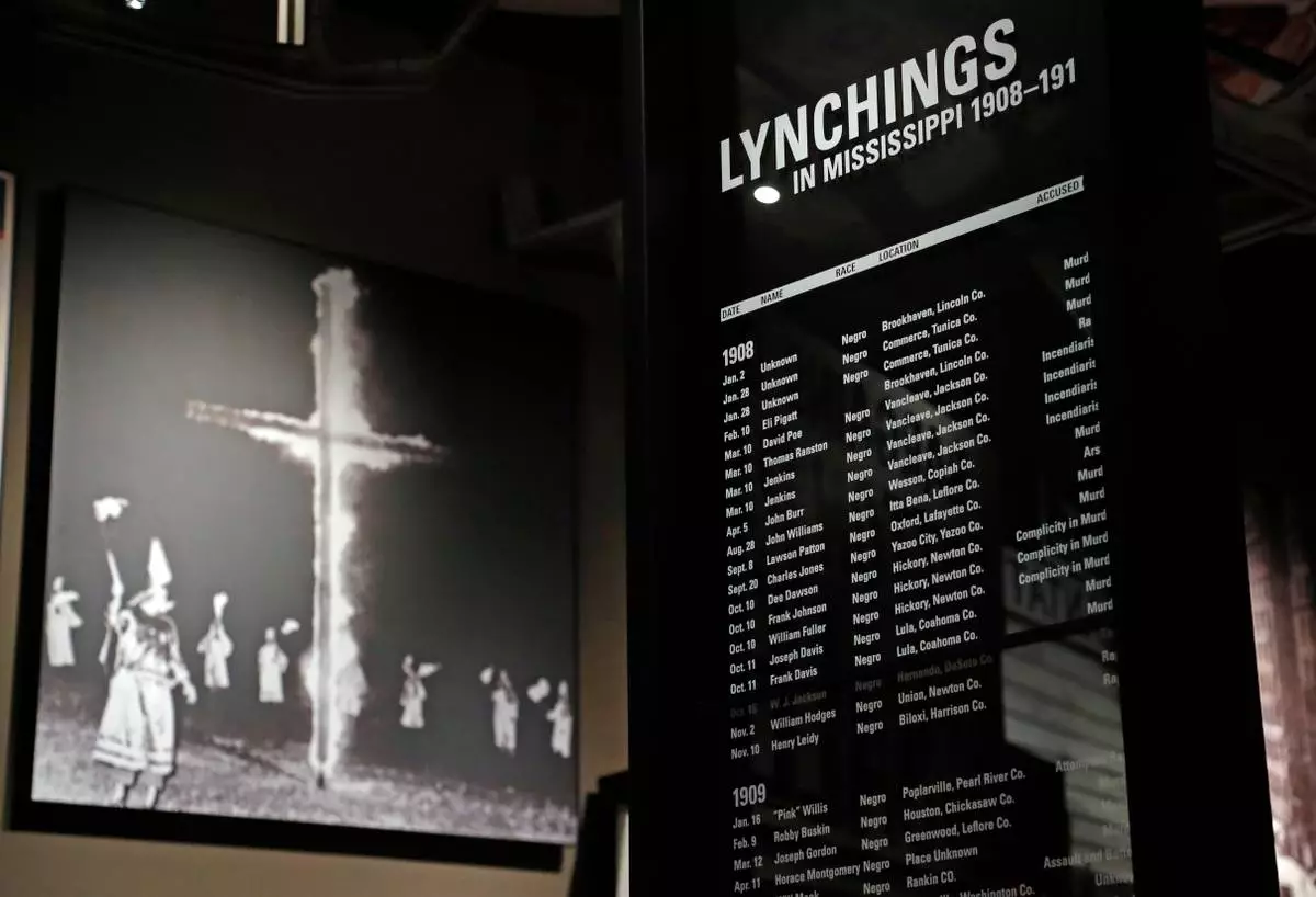 FILE - A monolith listing the names, dates and rationale for the lynching of African-American residents rests in the foreground of a photograph of a burning Ku Klux Klan cross on display in the Mississippi Civil Rights Museum in Jackson, Miss, Nov. 10, 2017. (AP Photo/Rogelio V. Solis, file)