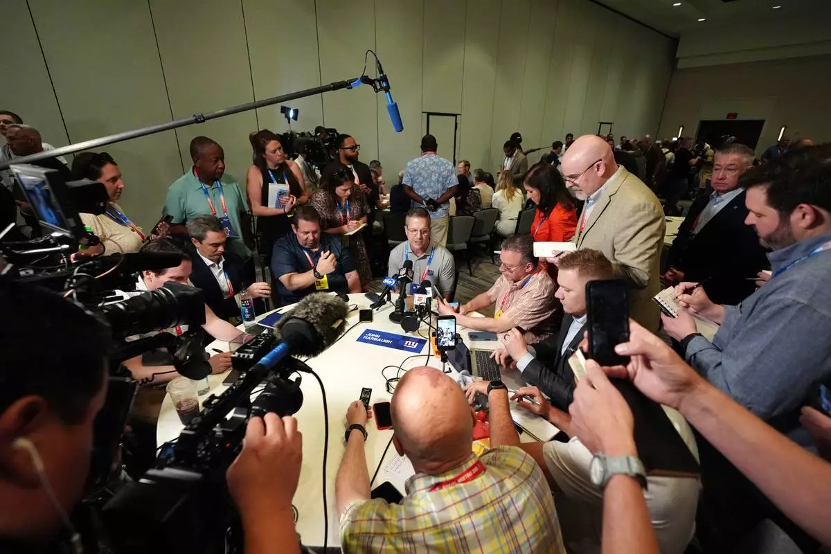 New York Giants head coach John Harbaugh talks with reporters at the annual NFL football meetings, Monday, March 30, 2026, in Phoenix. (AP Photo/Ross D. Franklin)
