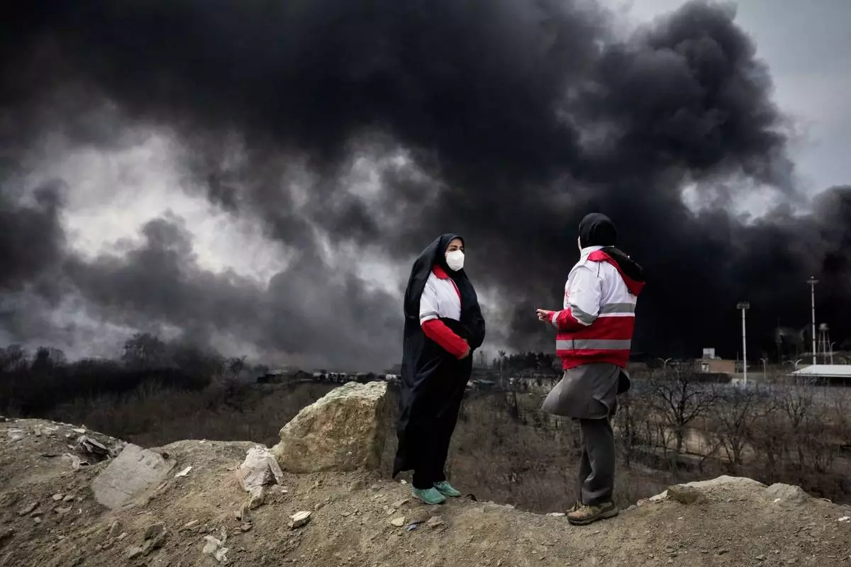 FILE - Two women from the Iranian Red Crescent Society stand as a thick plume of smoke from a U.S.-Israeli strike on an oil storage facility late Saturday rises into the sky in Tehran, Iran, Sunday, March 8, 2026. (AP Photo/Vahid Salemi, File)