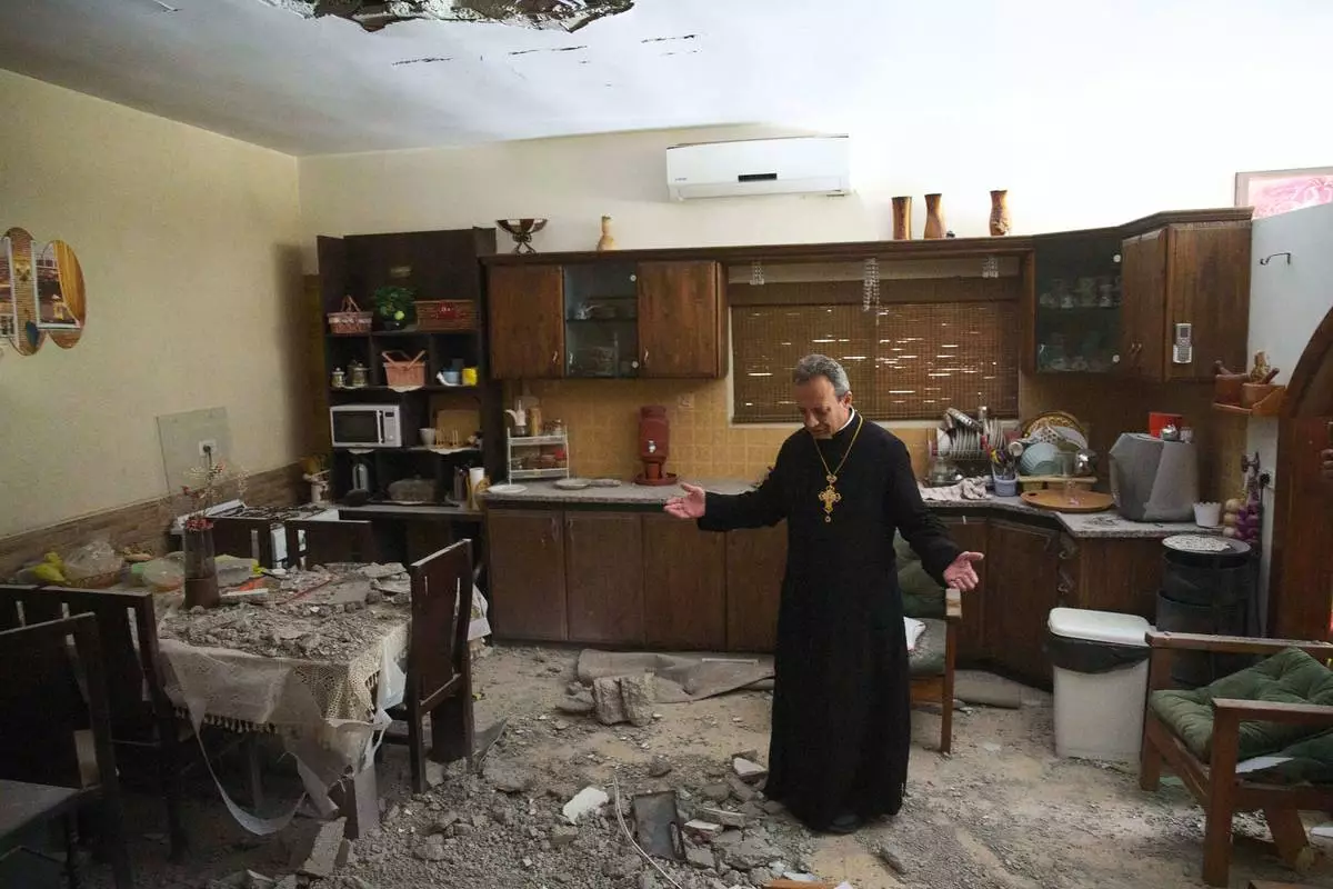 Monsignor Simon Khoury inspects a damaged house following an Iranian missile strike in Shefaram, Israel, Monday, March 30, 2026. (AP Photo/Ariel Schalit)