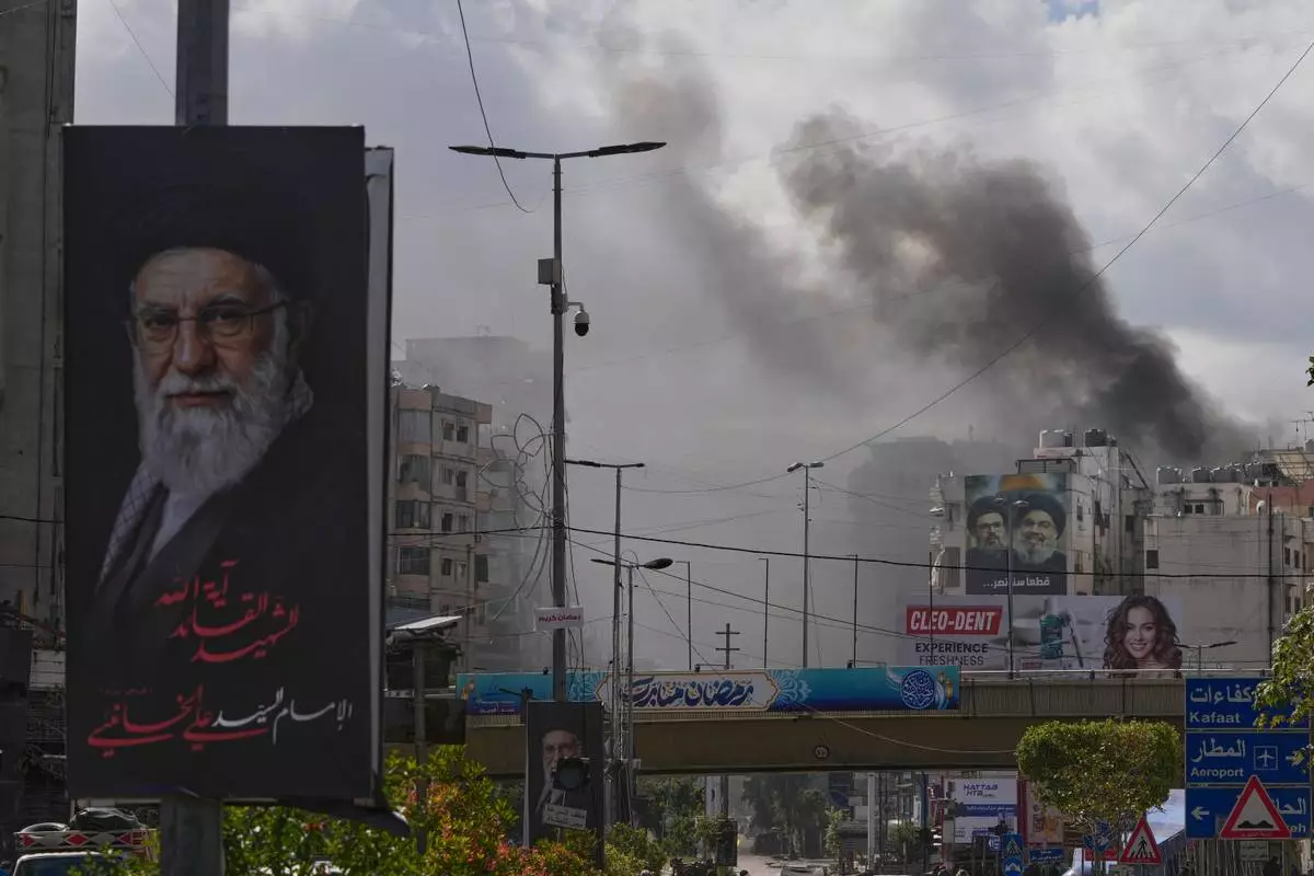 A portrait of Iran's late Supreme Leader Ayatollah Ali Khamenei, left, is seen, as smoke rises following an Israeli airstrike in Dahiyeh, Beirut's southern suburbs, Lebanon, Monday, March 30, 2026. (AP Photo/Hassan Ammar)