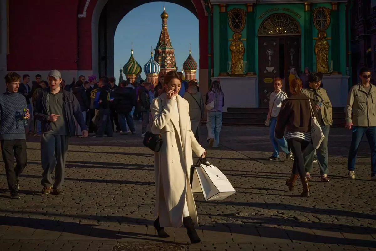 A woman speaking on the phone and carrying shopping bags leaves Red Square at sunset in Moscow, Monday, March 30, 2026, backdropped by the St. Basil's Cathedral. (AP Photo/Alexander Zemlianichenko)