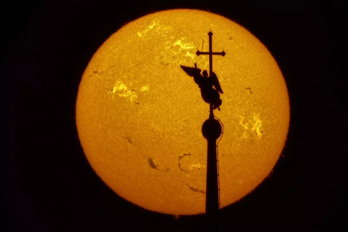 In this photo taken with a solar telescope, the city landmark, a weather vane in the form of an angel fixed atop a spire of the Saints Peter and Paul Cathedral, is silhouetted against the sun that shows solar activity zones, at sunset in St. Petersburg, Russia, Monday, March 30, 2026. (AP Photo/Dmitri Lovetsky)