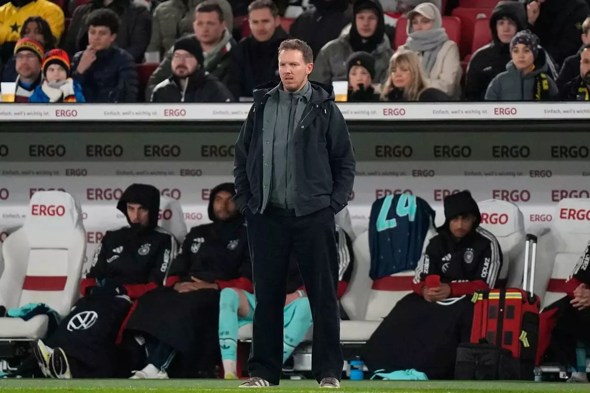 Head coach Julian Nagelsmann of Germany reacts during an international friendly soccer match between Germany and Ghana in Stuttgart, Germany, Monday, March 30, 2026. (AP Photo/Matthias Schrader)