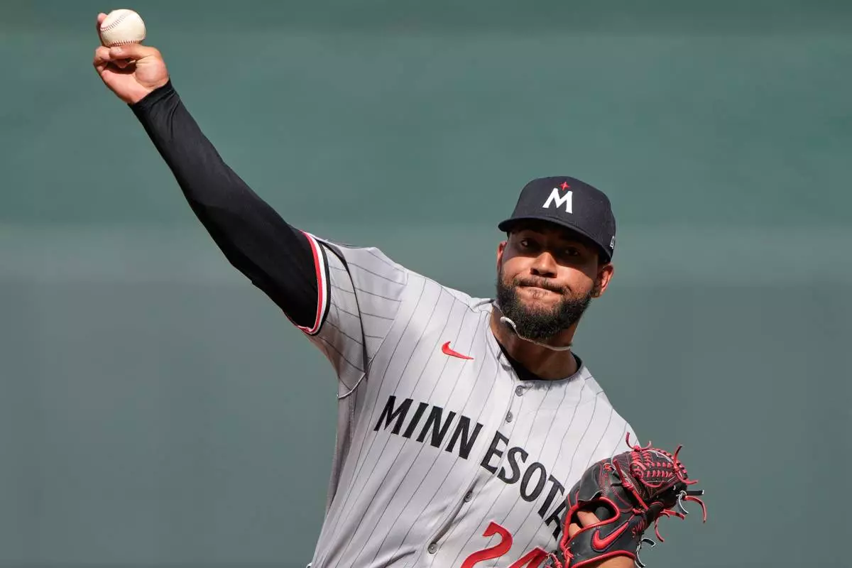 Minnesota Twins starting pitcher Simeon Woods Richardson throws during the first inning of a baseball game against the Kansas City Royals, Monday, March 30, 2026, in Kansas City, Mo. (AP Photo/Charlie Riedel)