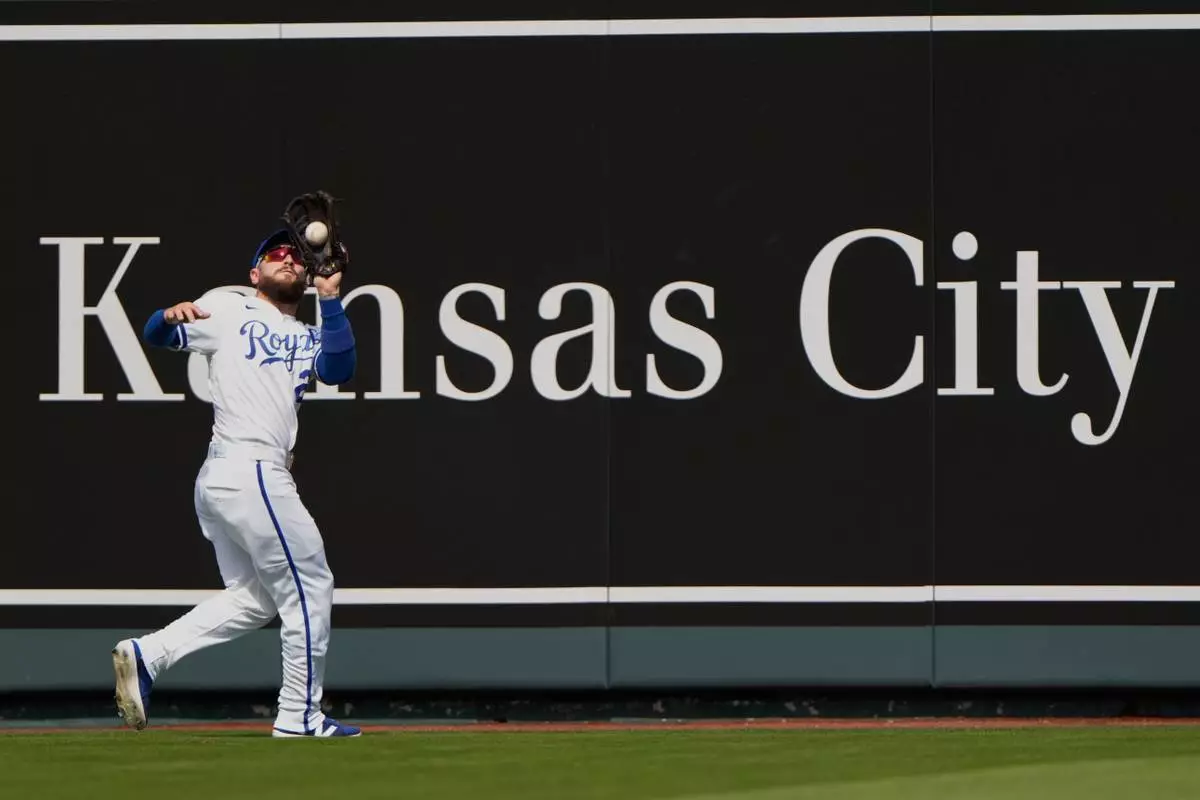 Kansas City Royals center fielder Kyle Isbel catches a fly ball for the out on Minnesota Twins' Ryan Jeffers during the first inning of a baseball game, Monday, March 30, 2026, in Kansas City, Mo. (AP Photo/Charlie Riedel)