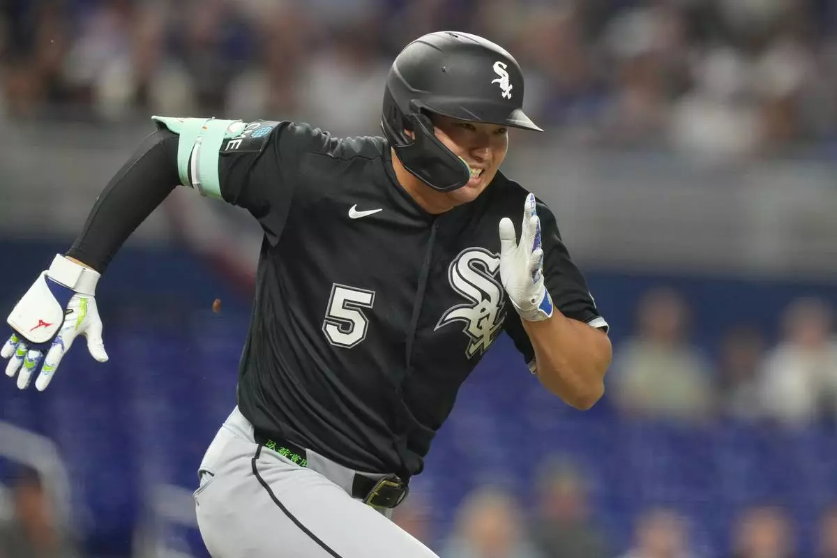 Chicago White Sox Munetaka Murakami (5) runs after hitting a single during the third inning of a baseball game against the Miami Marlins Monday, March 30, 2026, in Miami. (AP Photo/Marta Lavandier)