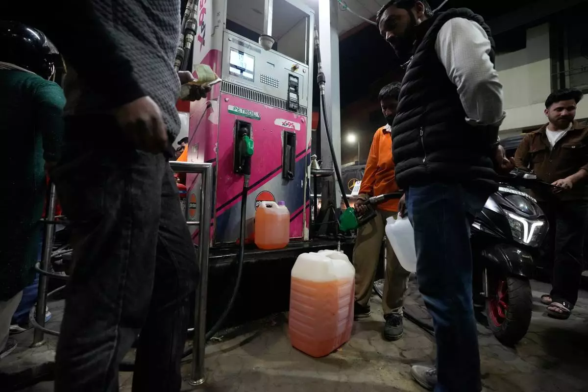 FILE - People store fuel in a plastic can at a petrol pump amid fears of a possible shortage due to the US Iran war, in Srinagar, Indian controlled Kashmir, Wednesday, March 25, 2026. (AP Photo/Mukhtar Khan, file)