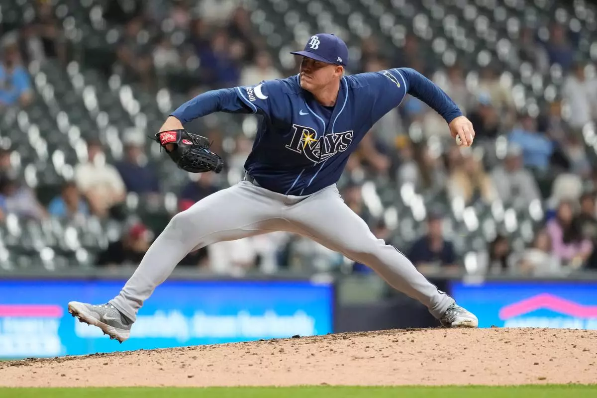 Tampa Bay Rays' Garrett Cleavinger pitches during the eighth inning of a baseball game against the Milwaukee Brewers, Monday, March 30, 2026, in Milwaukee. (AP Photo/Aaron Gash)