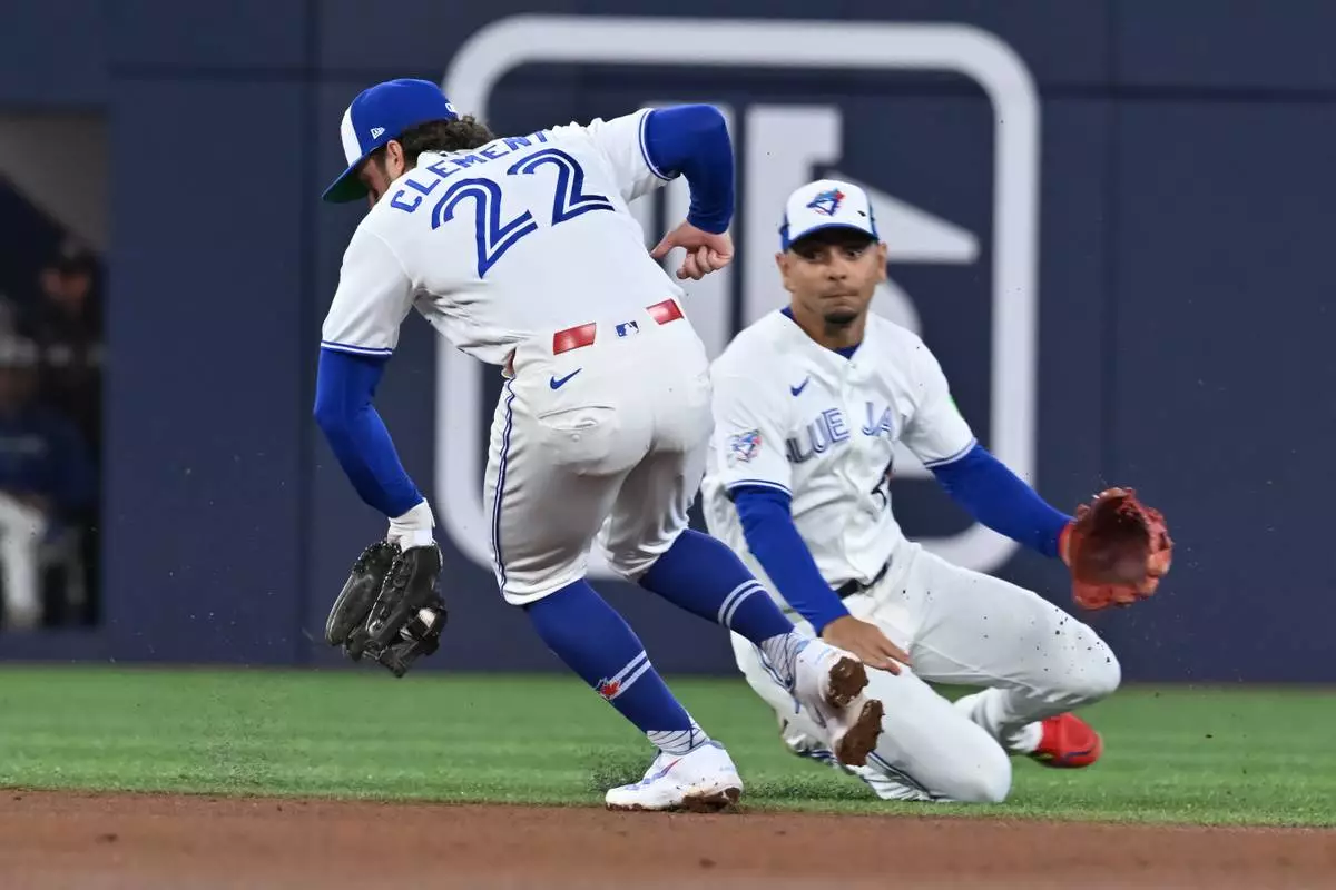Toronto Blue Jays' Ernie Clement (22) fields a ground ball off the bat of Colorado Rockies infielder Kyle Karros in front of teammate Andres Gimenez during fourth inning interleague baseball action in Toronto on Monday, March 30, 2026.