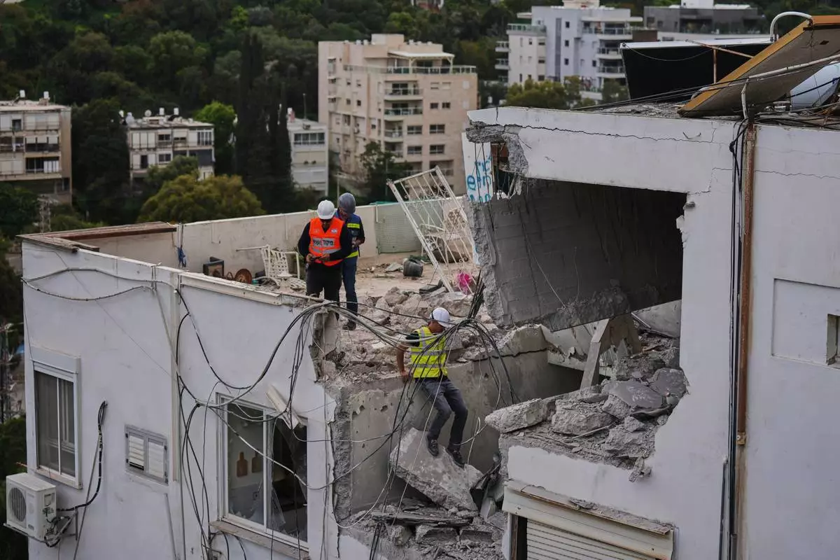 Israeli authorities inspect a damaged house following an Iranian missile strike in Haifa, Israel, Monday, March 30, 2026. (AP Photo/Ariel Schalit)