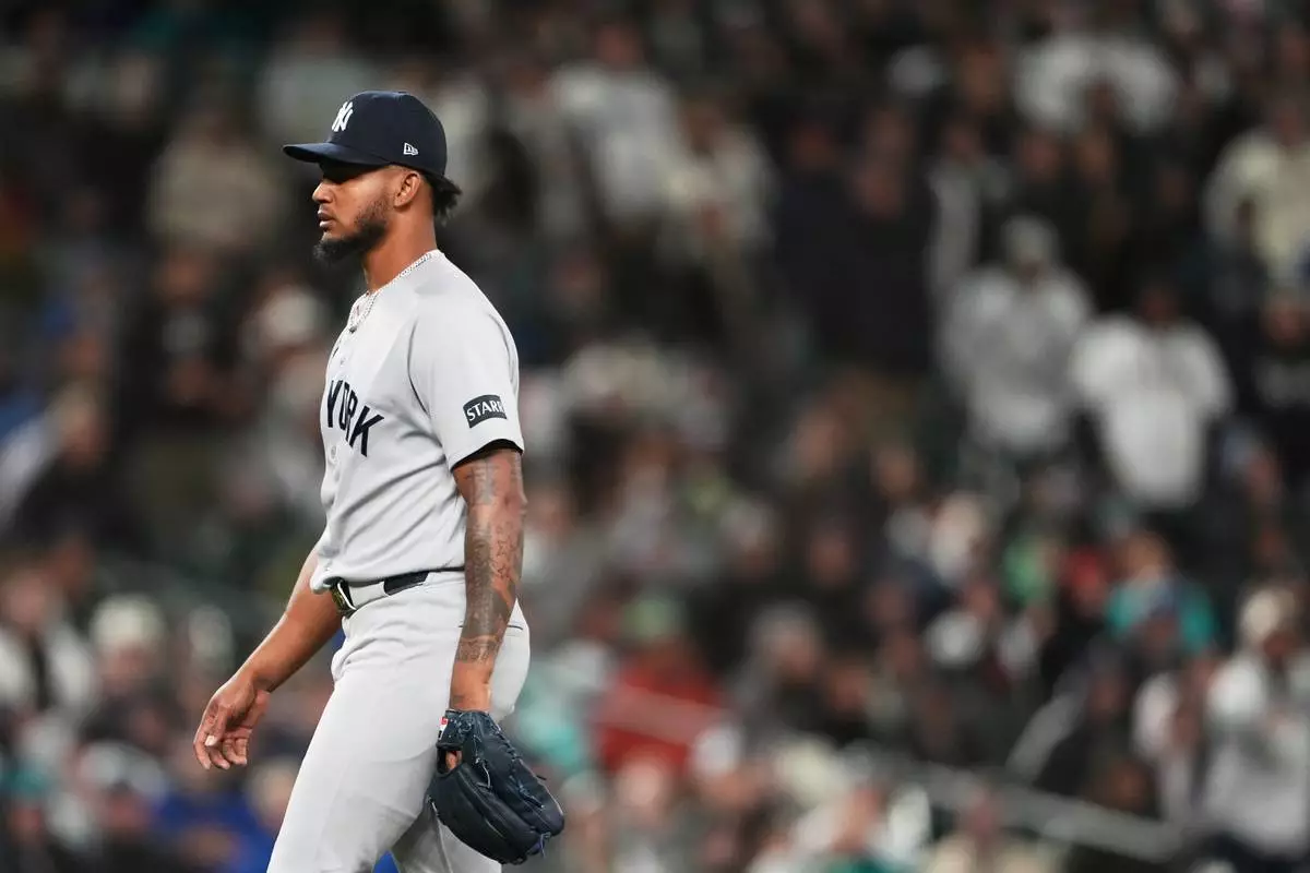 New York Yankees relief pitcher Camilo Doval walks to the dugout after retiring the side against the Seattle Mariners during the seventh inning of a baseball game, Monday, March 30, 2026, in Seattle. (AP Photo/Lindsey Wasson)