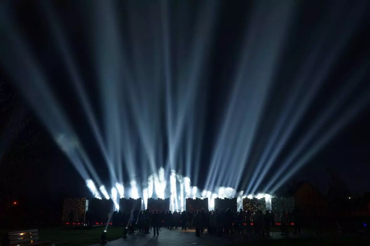 People attend a ceremony at a memorial for killed civilians to mark the fourth anniversary of the liberation of Bucha, Ukraine, on Monday, March 30, 2026. (AP Photo/Evgeniy Maloletka)