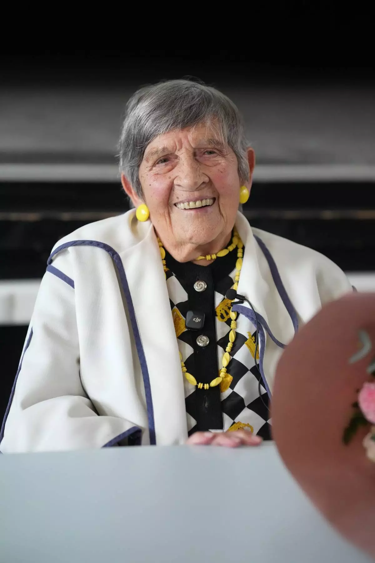 Ginette Kolinka, a 101-year-old survivor of Auschwitz, smiles after a meeting with pupils in a Paris-region high school in Saint-Maur-des-Fosses, outside Paris, France, March 21, 2026. (AP Photo/Thibault Camus)