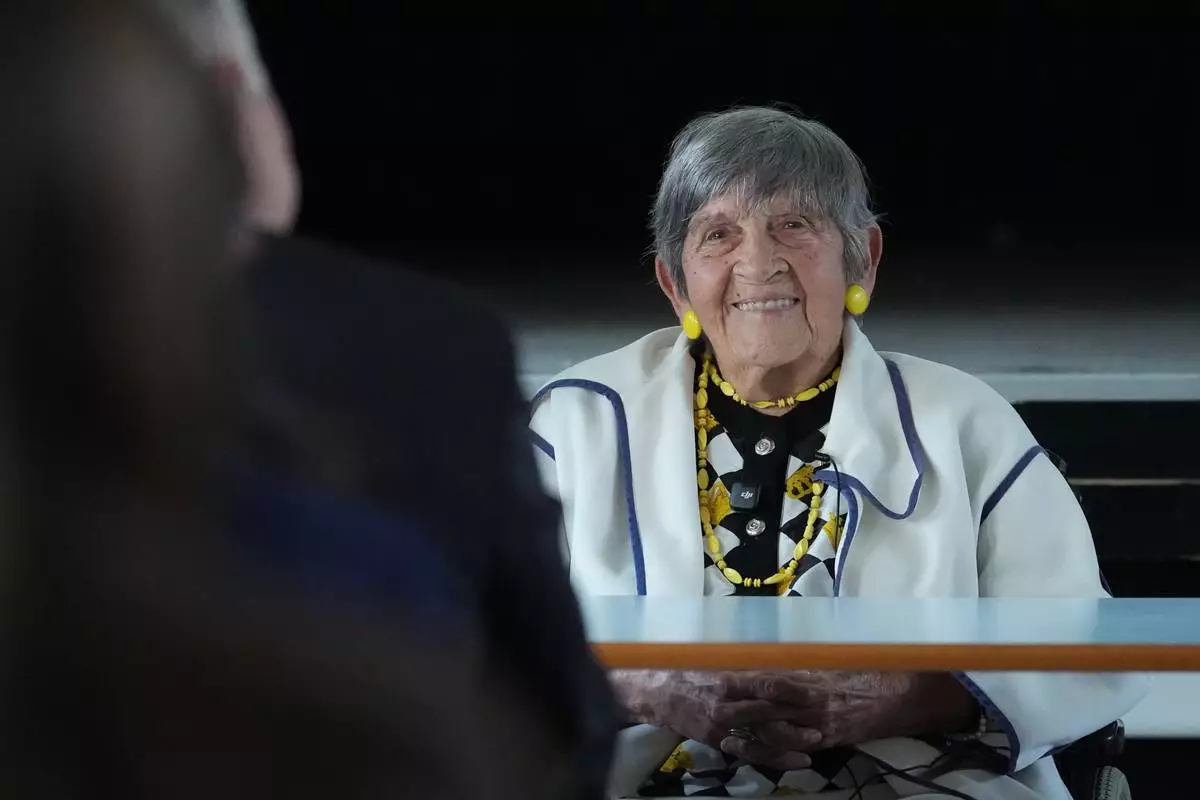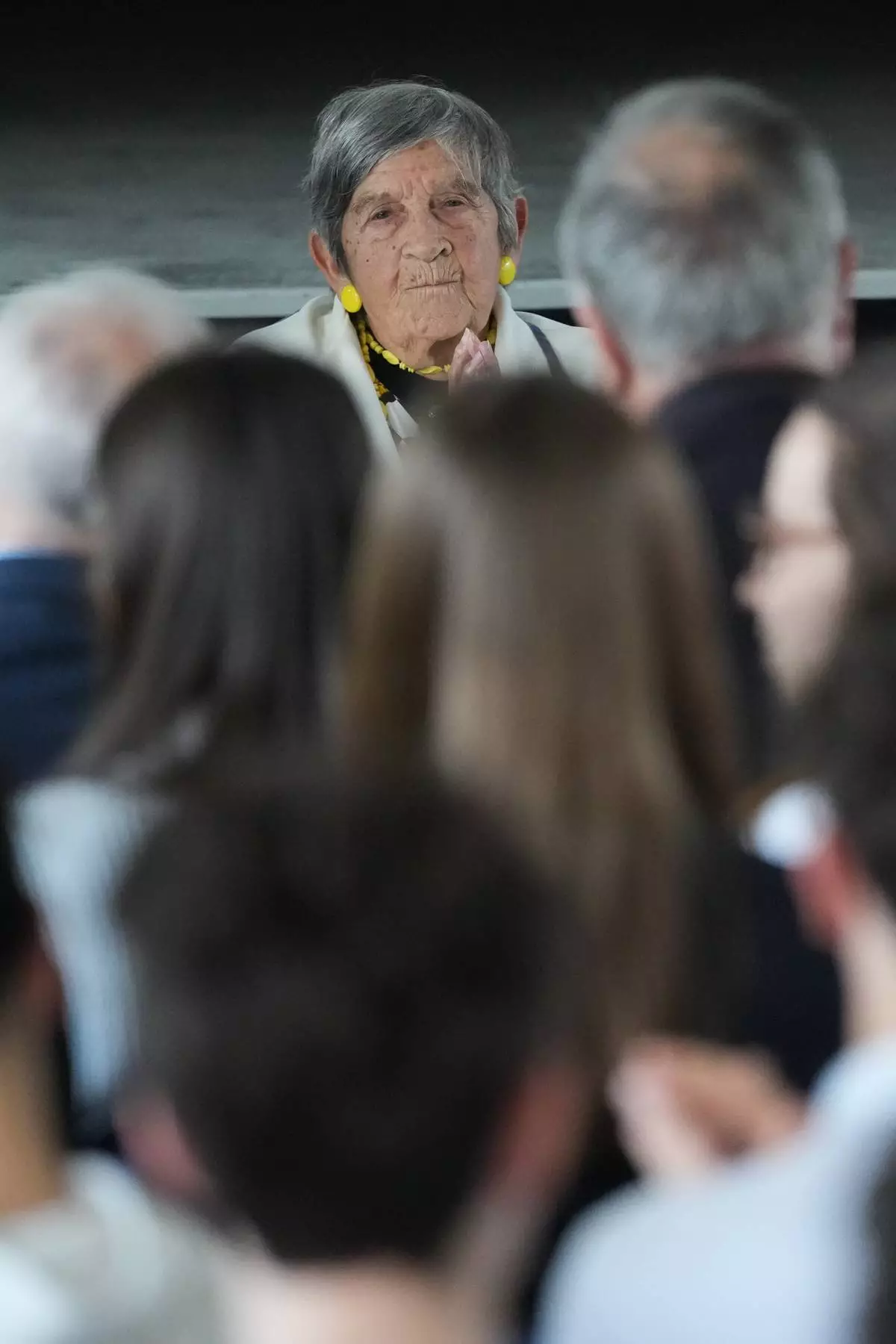 Ginette Kolinka, a 101-year-old survivor of Auschwitz, during a meeting with pupils in a Paris-region high school in Saint-Maur-des-Fosses, outside Paris, France, March 21, 2026. (AP Photo/Thibault Camus)