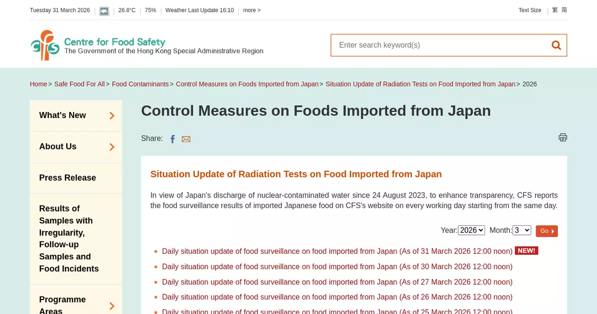 Separately, in response to the Japanese Government's discharge of nuclear-contaminated water at the Fukushima Nuclear Power Station, the CFS will continue enhancing the testing on imported Japanese food, and make reference to the risk assessment results to adjust relevant surveillance work in a timely manner. The CFS will announce every working day on its dedicated webpage (www.cfs.gov.hk/english/programme/programme_rafs/daily_japan_nuclear_incidents.html) the radiological test results of the samples of food imported from Japan, with a view to enabling the trade and members of the public to have a better grasp of the latest safety information.
