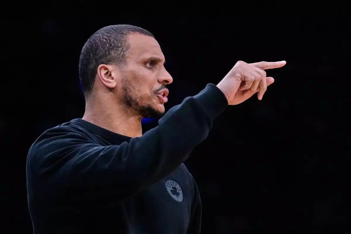 Boston Celtics head coach Joe Mazzulla reacts during the second half of an NBA basketball game against the Charlotte Hornets in Charlotte, N.C., Sunday, March 29, 2026. (AP Photo/Nell Redmond)