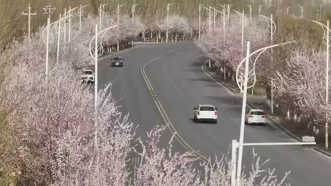 In Tumxuk City of northwest China's Xinjiang Uygur Autonomous region, beautiful blooming apricot trees have formed a picturesque flower road along the Binhe Avenue in the city center.