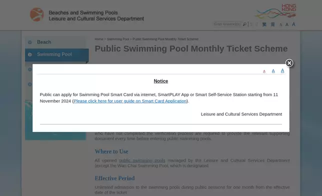 Holders of the public swimming pool monthly ticket are encouraged to apply for monthly ticket smart cards, which are printed with the card holder's photo and preloaded with information on the validity period. The smart cards enable holders to enter the pools easily and conveniently without having to produce documentary proof of identity. Interested monthly ticket holders can apply for smart cards free of charge. For details, please visit the webpage www.lcsd.gov.hk/en/beach/swim-intro/swim-ticket.html.