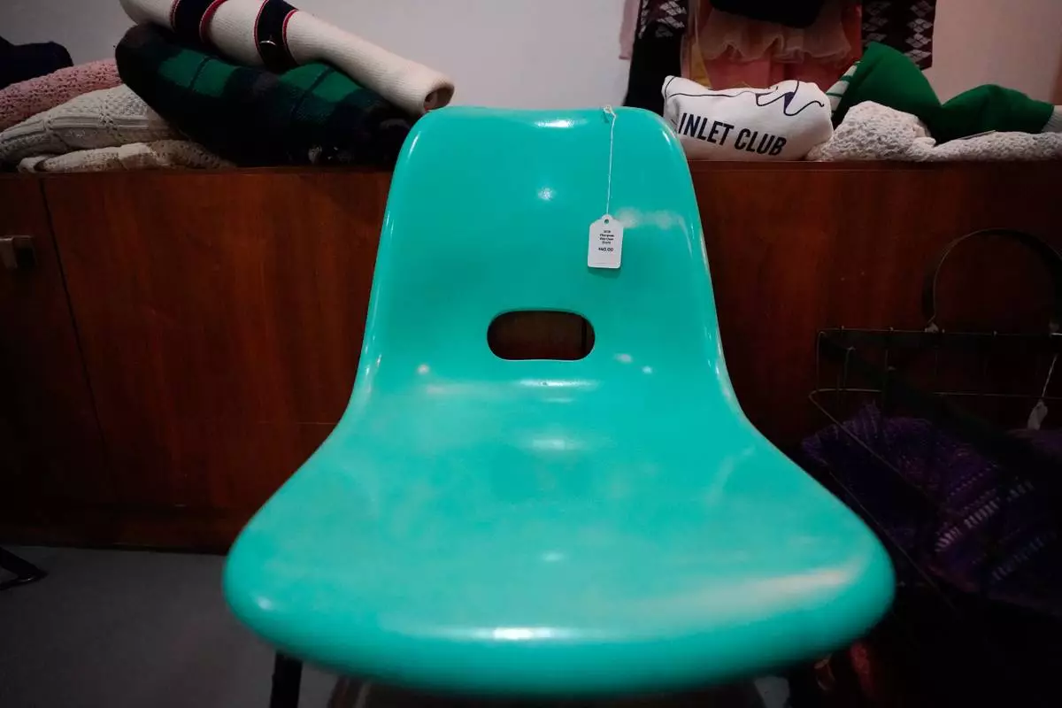 A chair is for sale at Mothership, a vintage and thrift store, Thursday, March 26, 2026, in New York. (AP Photo/Alyssa Goodman)
