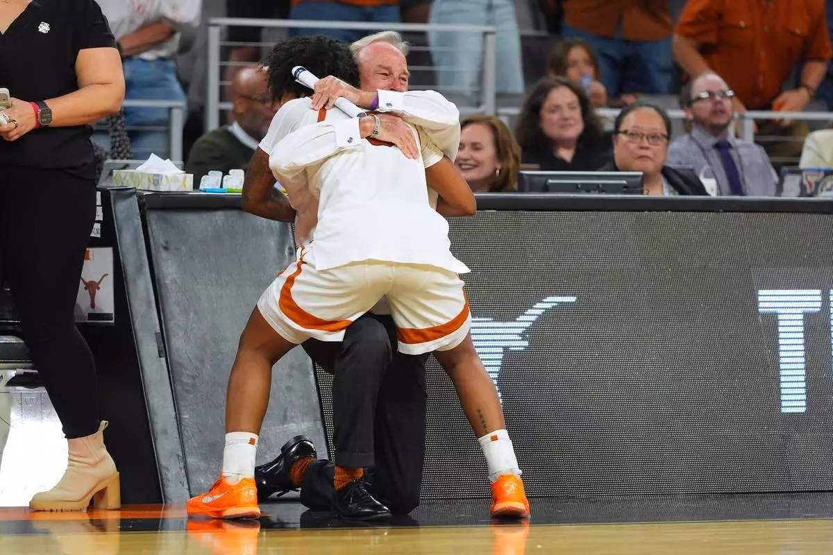 Texas guard Rori Harmon (3) hugs head coach Vic Schaefer against Michigan during the second half in the Elite Eight of the NCAA college basketball tournament, Monday, March 30, 2026, in Fort Worth, Texas. (AP Photo/LM Otero)