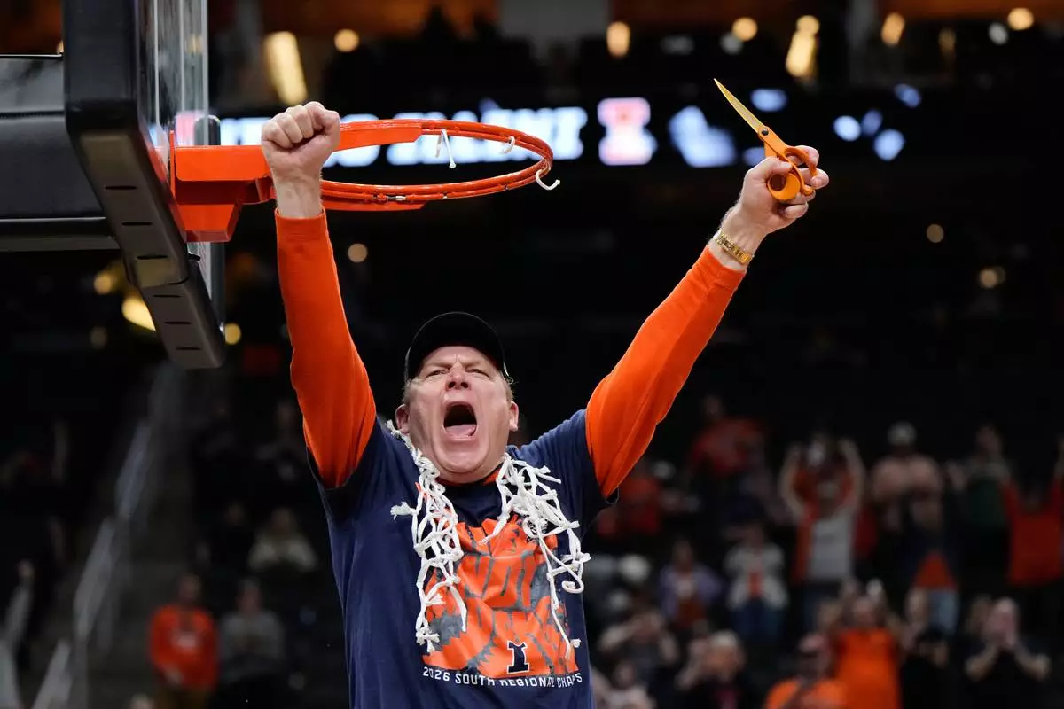 Illinois coach Brad Underwood celebrates after Illinois beat Iowa in an Elite Eight game in the NCAA college basketball tournament Saturday, March 28, 2026, in Houston. (AP Photo/Ashley Landis)