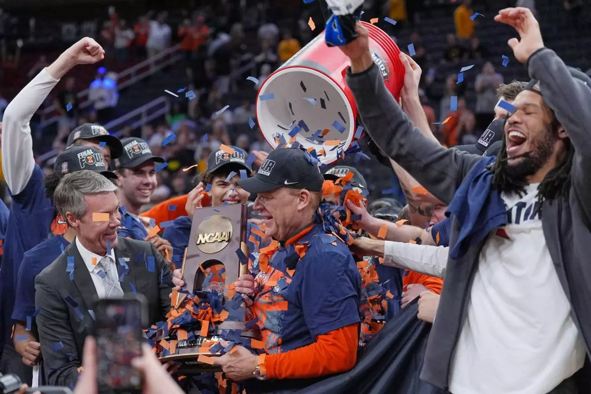 Illinois' Brad Underwood, center, celebrates with players after an Elite Eight game against Iowa in the NCAA college basketball tournament Saturday, March 28, 2026, in Houston. (AP Photo/Ashley Landis)