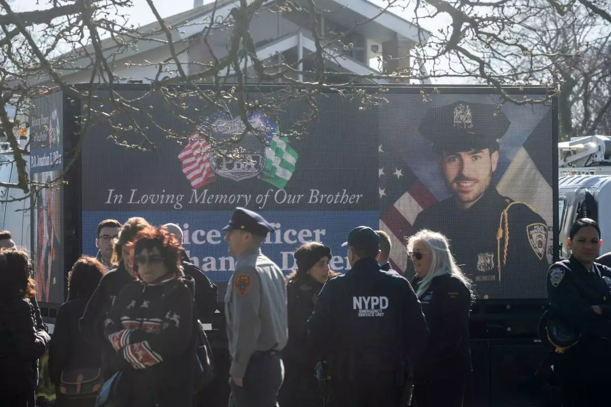 FILE - New York Police Department Officer Jonathan Diller is on a screen during his funeral service at Saint Rose of Lima R.C. Church in Massapequa Park, N.Y., March 30, 2024. (AP Photo/Jeenah Moon, File)