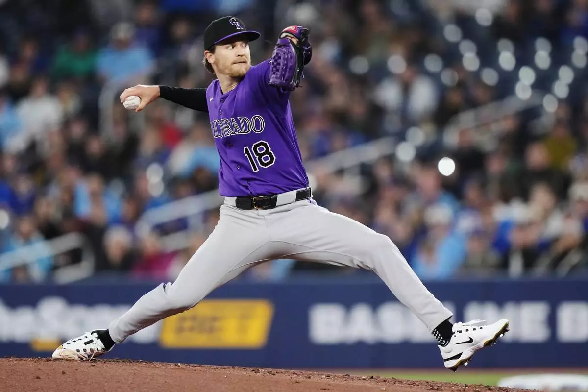 Colorado Rockies pitcher Ryan Feltner (18) works against the Toronto Blue Jays during first inning MLB baseball action in Toronto on Tuesday, March 31, 2026. (Nathan Denette/The Canadian Press via AP)