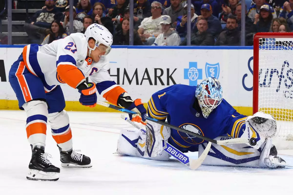 Buffalo Sabres goaltender Ukko-Pekka Luukkonen (1) stops New York Islanders left wing Anders Lee (27) on a penalty shot during the second period of an NHL hockey game Tuesday, March 31, 2026, in Buffalo, N.Y. (AP Photo/Jeffrey T. Barnes)