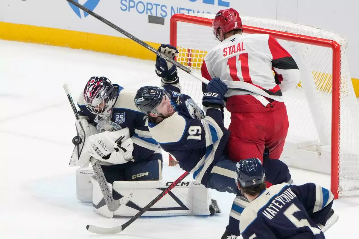 Columbus Blue Jackets goaltender Jet Greaves, left, blocks a shot as Carolina Hurricanes center Jordan Staal (11) checks center Adam Fantilli (19) in the second period of an NHL game in Columbus, Tuesday, March 31, 2026. (AP Photo/Sue Ogrocki)