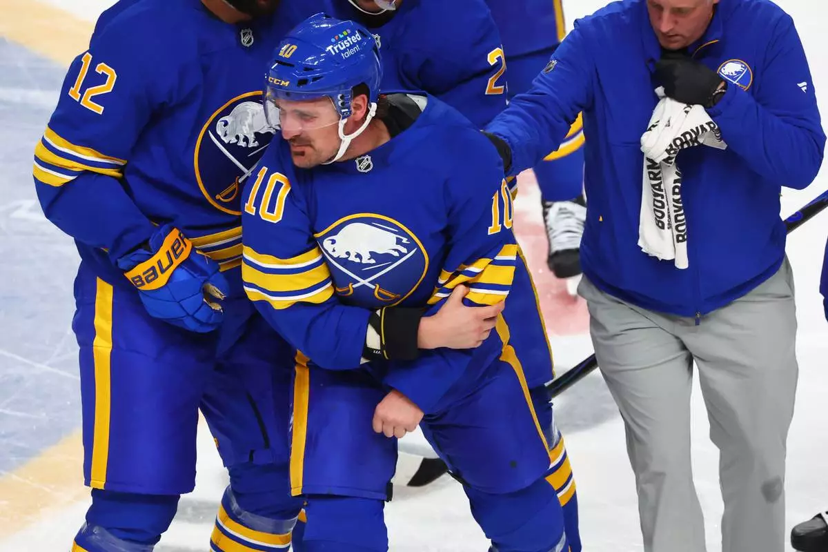 Buffalo Sabres center Sam Carrick (10) is helped off the ice after a fight with New York Islanders left wing Anders Lee (27) during the third period of an NHL hockey game, Tuesday, March 31, 2026, in Buffalo, N.Y. (AP Photo/Jeffrey T. Barnes)