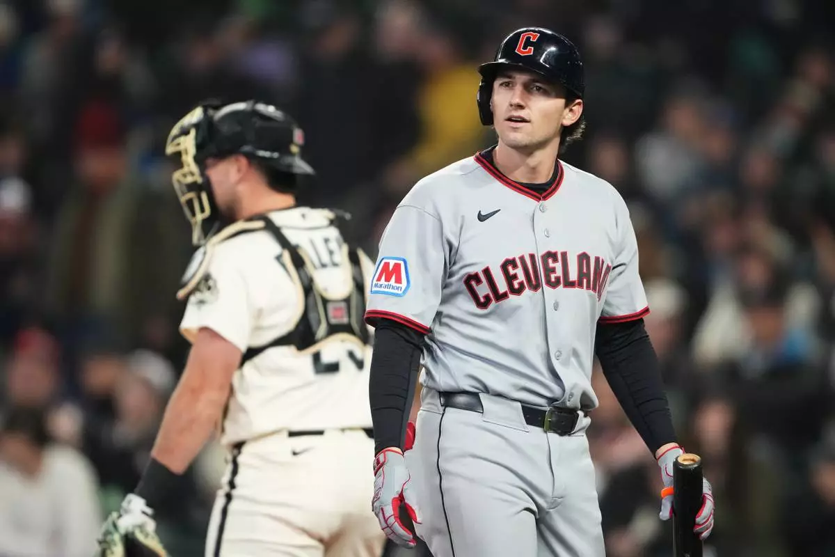 Cleveland Guardians' Chase DeLauter walks to the dugout after striking out against Seattle Mariners starting pitcher Emerson Hancock during the first inning of a baseball game, Sunday, March 29, 2026, in Seattle. (AP Photo/Lindsey Wasson)