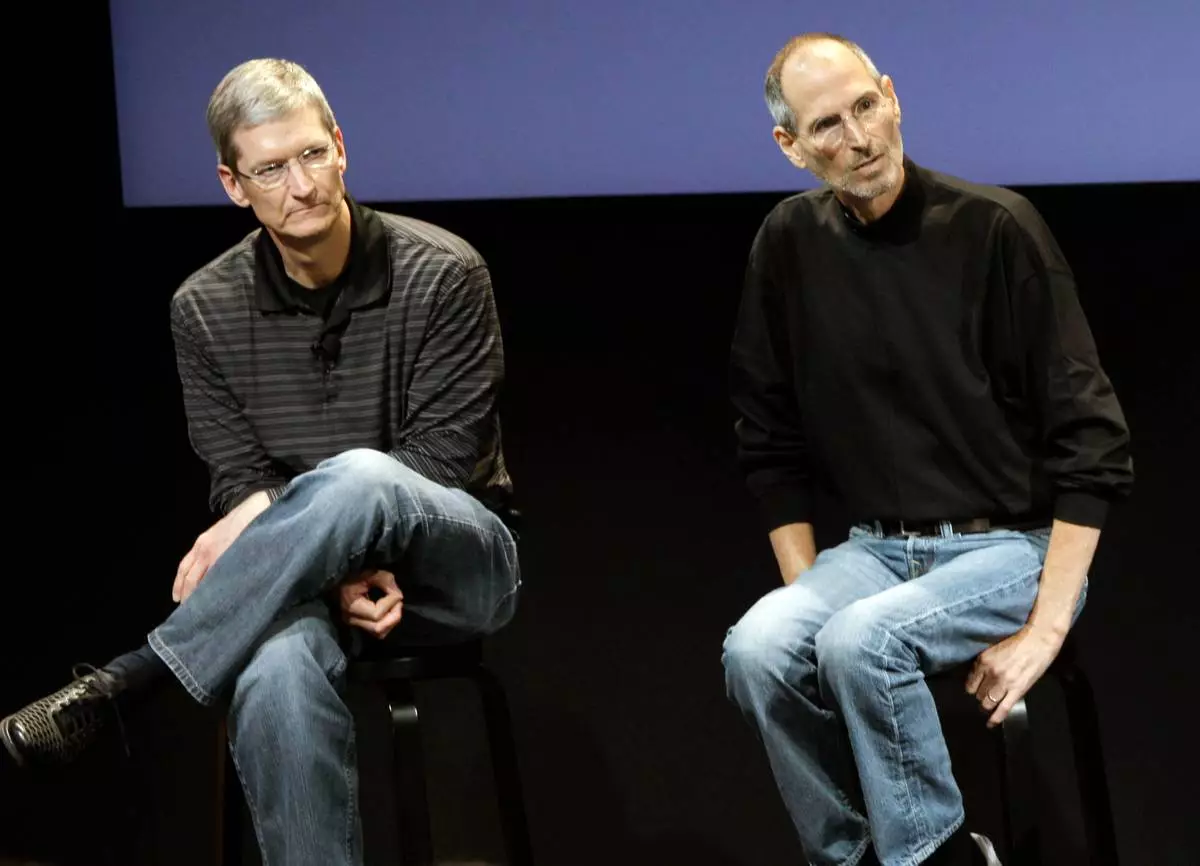 FILE - This July 16, 2010 photo shows Apple's Tim Cook, left, and Steve Jobs, right, during a meeting at Apple in Cupertino, Calif. (AP Photo/Paul Sakuma, File)