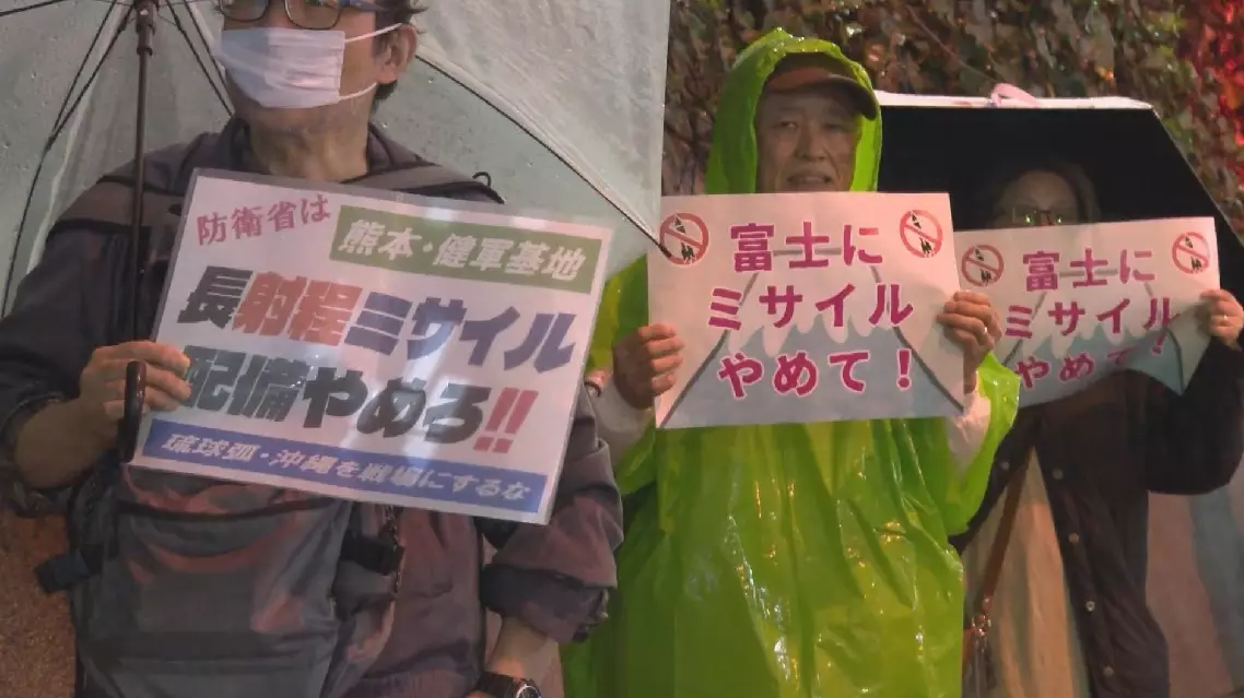 A group of Japanese residents gathered outside the Ministry of Defense in Tokyo on Tuesday evening, protesting Japan's deployment of long-range missiles at two Ground Self-Defense Force bases.